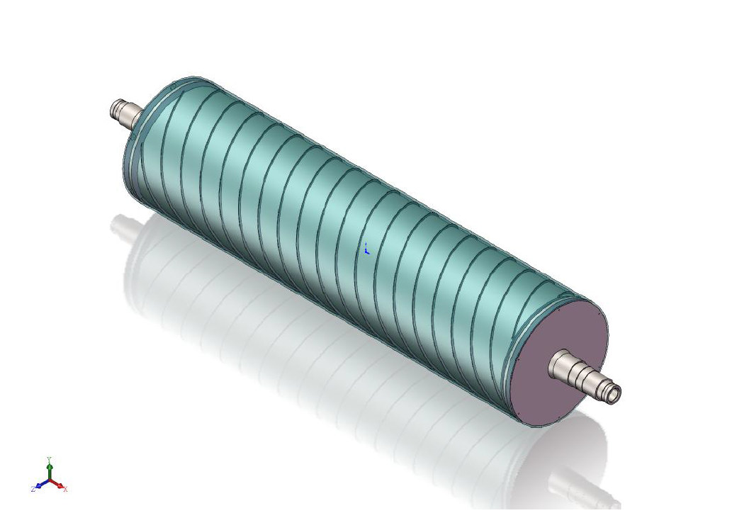 雙流道大直徑流延主冷輥,包括輥筒、進水導(dǎo)流器、出水導(dǎo)流器,進水軸頭管和出水軸頭管,輥筒包括外筒、與外筒同軸設(shè)置的內(nèi)筒和在外筒、內(nèi)筒之間設(shè)置的多個螺旋導(dǎo)流片,相鄰兩個螺旋導(dǎo)流片構(gòu)成一個螺旋導(dǎo)流槽,進水導(dǎo)流器、出水導(dǎo)流器分別固定連接在輥筒的兩端,進水軸頭管和出水軸頭管分別安裝在進水導(dǎo)流器、出水導(dǎo)流器上。大直徑流延主冷輥,結(jié)構(gòu)簡單,由于設(shè)置了進水導(dǎo)流器和出水導(dǎo)流器,可有效降低主冷輥內(nèi)部的流動阻力,能夠使得流入輥筒內(nèi)的冷卻水量更加均勻,提高主冷輥的送水能力,提高主冷輥冷卻效率,有效提高輥筒表面的溫度均勻性,節(jié)約能耗。